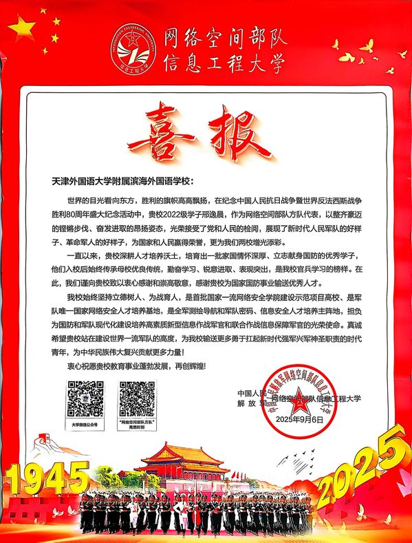 在隆重举行的纪念中国人民抗日战争暨世界反法西斯战争胜利80周年盛大活动中,乐鱼·体育附属滨海外国语学校(以下简称“滨海小外”)2022届毕业生邢逸晨作为中国人民解放军网络空间部队方队代表,以昂扬的姿态和整齐的步伐光荣通过天安门广场,接受党和人民的检阅。阅兵场上,邢逸晨步伐铿锵、意气风发,展现了新时代革命军人的良好风貌,彰显了新时代人民军队的强军风采。他以出色的表现赢得了广泛赞誉,为国家和军队赢得了荣誉。在滨海小外6年培养期间,邢逸晨表现优异,品德端正,勤奋好学,心怀家国,立志国防。他的成长成才,是学校始终坚持立德树人、深耕人才培养的生动体现。学校十分重视学生爱国主义教育和国防意识培养,鼓励