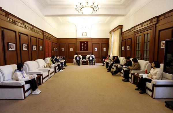 3月8日,天津市人民政府外事办公室领导班子成员、天津市城市国际化研究中心主任曹汉军,国研中心党支部书记、副主任薛钰,副主任刘大伟,交流部负责人胡蔼君一行来访我校。校党委副书记、校长陈法春会见来访客人。会上,曹汉军对我校在外事工作上给予的大力支持表示感谢。他指出,双方要紧扣天津全面建设社会主义现代化大都市的目标任务,高站位、全方位、多点位提升外事综合服务水平。一是加强天津市外事翻译人才库建设,为国家和天津经济社会发展提供智力支持。二是加强涉外志愿服务工作,利用大型国际会议和活动,面向世界全面生动展示天津的魅力和活力。三是加强智库建设和项目合作,推动地方外事工作理论与实践创新,持续提升天津的国际知名度。陈法春对市外办一行表示欢迎,他介绍了学校近期在国际传播能力建设、学科专业建设、国际化人才培养等方面取得的成绩。他表示,学校将深入落实天津“十项行动”,积极响应科教兴市人才强市行动要求,深化与市外办的交流合作,找准合作契合点,凝聚发展合力。学校将按照双方达成的共识,全力推进小语种翻译人才储备工作,健全人才培养工作体系;强化高端翻译人才培养,主动服务天津对外开放和国际化发展;联合策划制作多语种文