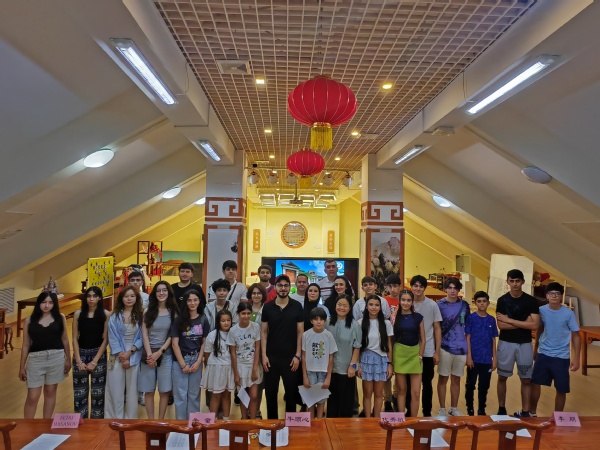 7 月 7 日至 19 日,天外迎来36 名阿塞拜疆青年,正式开启为期两周的“丝路同行”研学之旅。学院提前组建工作专班,统筹课程设计、线路踩点、师资配备与保障;阿塞拜疆师生带着好奇与热情远道而来,双方在欢迎仪式上共同按下启动键,为中阿青年交流写下新的序章。在津期间,同学们用脚步丈量历史,用镜头记录当下。清晨的五大道静谧悠长,红砖藤蔓在朝阳下泛着柔光,大家轻触墙面,仿佛触摸百年前的中西商旅脉搏;午后走进民园广场,复古拱门与草坪音乐会让“老天津”的摩登余韵扑面而来;夜幕降临,海河游船缓缓前行,两岸灯光倒映水面,古建筑与摩天楼并肩而立,同学们发出阵阵惊叹,纷纷举起手机定格这座城市的开放与包容。在天津动物园,大熊猫懒洋洋地啃着竹子,金丝猴灵巧地跳跃,同学们第一次近距离观赏“中国国宝”,听保育员讲述濒危物种保护故事;转至北疆博物院,猛犸象化石与恐龙骨架让他们在亿万年时光中穿梭;走进滨海图书馆,波浪形书架与数字阅读仓带来未来感,感受科技让文明焕发的崭新魅力。传统文化工坊由学院教师与校外名家联合授课,书法、国画、太极三大板块依次展开。同学们提笔写下端庄的“福”字,又在宣纸上点染翠竹与熊猫;晨光中,他