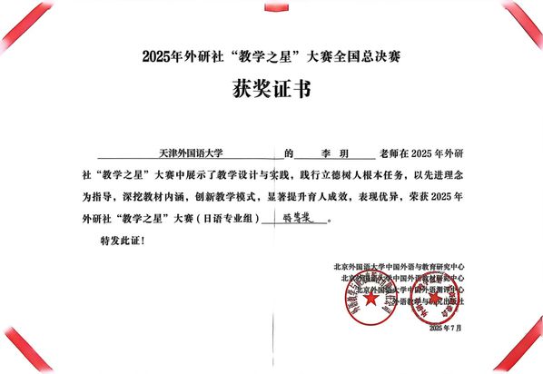 近日,2025年外研社“教学之星”大赛日语组全国总决赛在大连理工大学圆满落幕。我校日语教师李玥凭借出色的表现,在日语专业组的激烈角逐中脱颖而出,荣获特等奖。本次大赛由北京外国语大学中国外语与教育研究中心、北京外国语大学中国外语教材研究中心、北京外国语大学中国外语测评中心、外语教学与研究出版社联合主办,以“外语教材的有效使用:聚力创新 分类卓越”为主题。来自全国各高校的150余位日语教师参与其中,经过复赛选拔,38位教师晋级全国总决赛。本届大赛全程线上直播,超1.5万人次在线观摩。我校李玥老师一路过关斩将,凭借新颖的教学视角、鲜活的课堂活动和多样的教学手段,在现场说课、教学展示、互动问答三个环节中展现出扎实的教学水平与深厚的专业素养,最终赢得了评审团的高度认可,摘得桂冠。李玥老师此次获奖,不仅是其个人教学能力的体现,更是我校长期以来重视教师队伍建设、着力提升教师教学水平的成果。我校始终将教师培养作为提升教学质量的核心环节,通过搭建各类教学交流平台、组织教学技能培训、鼓励教师参与高水平教学竞赛等方式,为教师的成长与发展创造良好条件,助力教师在教学实践中不断探索创新,提升教学能力。今后,我校