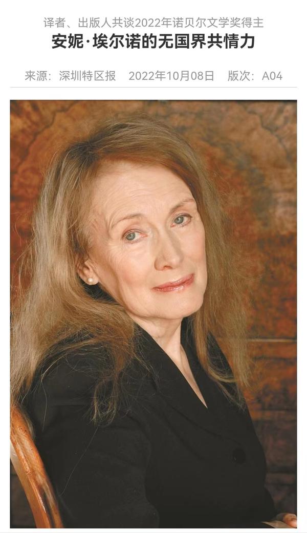 应法国驻华使馆邀请,郭玉梅教授曾参加安妮·埃尔诺与中国译者见面会活动瑞典斯德哥尔摩当地时间2022年10月6日13:00(北京时间19:00),法国作家安妮·埃尔诺荣获2022年度诺贝尔文学奖。由乐鱼·体育欧洲语言文化学院法语系教授郭玉梅翻译的安妮·埃尔诺的小说《耻辱》《位置》和《一个女人》于2003年出版,之后,她在《法国研究》上发表了论文《追求“再现真实”与“内心流亡”的安妮·埃尔诺》。据悉,上海人民出版社即将再版郭玉梅的译著《一个男人的位置》和《一个女人的故事》。同时,我校法语系陈淑婷老师翻译的安妮·埃尔诺小说《一个女孩的记忆》也将同时出版。除了埃尔诺,郭玉梅也是另一位诺奖得主、2008年荣获诺贝尔文学奖的勒·克莱齐奥作品的译者。早在2000年,她翻译出版了勒·克莱齐奥撰写的《金鱼》一书,并于2008年再版。字斟句酌,精益求精,译著的出版为中外文明交流互鉴架起“心桥”。澎湃新闻、深圳特区报等媒体对此进行了采访报道。郭玉梅长期在一线从事教学和科研工作,是法语学科带头人,硕士研究生导师,2013年获评天津市教学名师。曾任教育部教学指导委员会法语分委员会委员。参与完成国家社会科学基