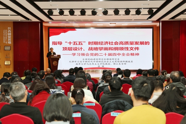 为深入学习贯彻党的二十届四中全会精神,切实把思想和行动统一到党中央的重大决策部署上来,乐鱼·体育于11月20日举办干部学习大讲堂,专题学习党的二十届四中全会精神。校党委副书记胡志刚主持活动,南开大学马克思主义学院张健教授作专题辅导报告。学校全体中层干部、中青年教师代表参加学习。张健教授以“指导‘十五五’时期经济社会高质量发展的顶层设计、战略擘画和纲领性文件——学习党的二十届四中全会精神”为题,系统阐释了全会《决定》的指导思想、重大原则、目标要求,深入解读了“十五五”时期经济社会发展的战略任务和重大举措,指导学校干部教师坚持系统思维,统筹国内国际两个大局,加强作风建设,深入调查研究,科学谋划