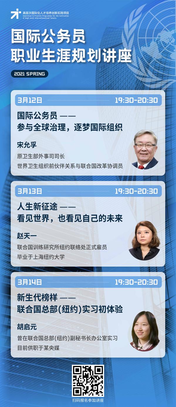 各位同学: 2020年,在教育部中外人文交流中心的支持下,经专家评审和答辩等环节,我校成功获批“高层次国际化人才培养创新实践基地”首批建设高校。该项目将通过“国际公务员职业生涯规划讲座”、“全球治理线上课程”、国际组织实训等系列项目,有针对性地培养和推送优秀学生赴国际组织实习。为提升我校学生参与国际项目和国际组织实习的竞争力,培养国际公务员基本素养,拓宽就业和发展空间,2021年春季学期国际公务员职业生涯规划系列讲座现已开放报名,欢迎感兴趣的同学积极报名参与。三位主讲嘉宾将围绕国际组织的实习与工作,分享经历和体会。 一、主题 主题1:参与全球治理,筑梦国际组织 主讲人:世界卫生组织前高级官员宋允孚先生 时间:3月12日19:30-20:30 主题2:人生新征途-看见世界,也看见自己的未来 主讲人:联合国训练研究所正式雇员赵天一女士 时间:3月13日19:30-20:30 主题3:新生代榜样-联合国总部(纽约)实习初体验 主讲人:曾实习于联合国总部副秘书长办公室胡启元女士 时间:3月14日19:30-20:30 二、报名方式 扫描下方海报二维码正确填写信息即可报名参与,报名学生将于每场讲