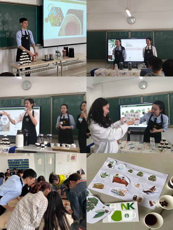 为提升我校大学生素质技能培养,丰富课程内容和形式,鼓励大学生积极就业,我校国际商学院与北京星巴克咖啡有限公司开展深度校企合作,继上学期线下宣讲会后,本学期启动8课时的咖啡专业课程,分别于4月6日、7日下午在滨海校区、马场道校区举办“Coffee100”课程开班仪式。国际商学院党委书记杨颖、副院长李薇,星巴克北区资深招募经理夏群、区域营运总监郭丹、营运经理蔡苗、盛金山,以及北区咖啡公使贾子熠、区咖啡大师张奕葳、魏雪岩、吴蔼静出席了本次活动。夏群从专业角度介绍了选修课的核心内容和历史意义。他表示,星巴克首次将企业内训课程推广至天津高校,希望这门课可以像咖啡豆一样种在每一位外大学子的心中。通过学习这门课程,同学们会对星巴克的企业文化有更深入的了解,也能掌握到比较全面的咖啡知识。希望在不久的将来,能在星巴克见到同学们的身影。杨颖表示,校企合作课程旨在培养高素质、全方位、与社会企业接轨的复合型人才。在大学生就业情况不容乐观的当下,学院尽可能为同学们提供就业前置化的可能,营造良好的学习氛围,健全成熟的就业观,以便将来更好地走进社会、融入社会。希望这门课程不仅可以激发同学们的学习兴趣,在咖啡领域有新