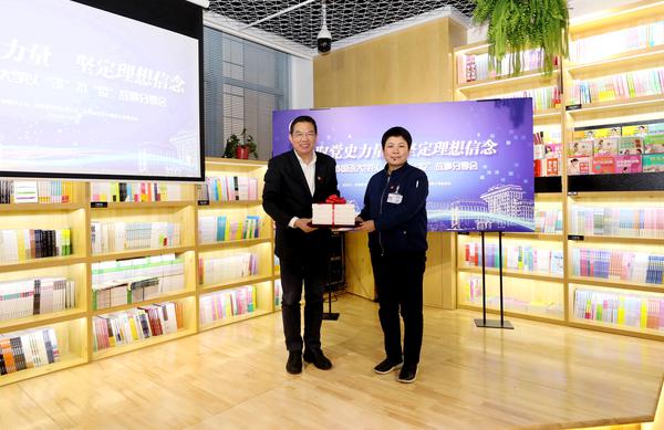 校党委书记殷奇向图书大厦赠送书籍