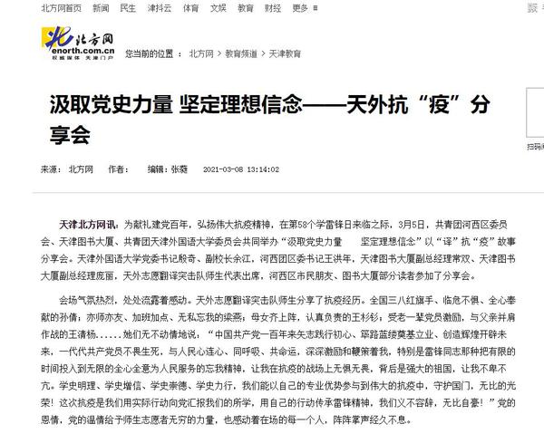 北方网以《汲取党史力量 坚定理想信念------天外抗“疫”分享会》为题目进行了报道。