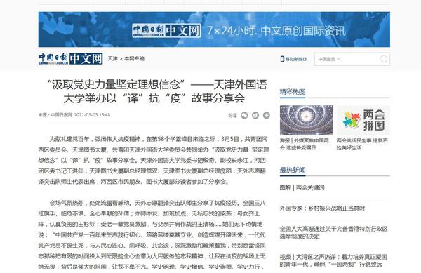 3月6日,《天津日报》以《以“译”抗“疫”故事分享会感动全场》为题目进行了报道。