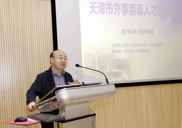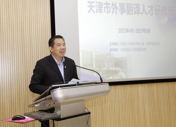 据悉,本次研修班由我校与天津市人民政府外事办公室共同主办,高级翻译学院承办,旨在提升天津市外事翻译队伍综合素质和业务能力,为推动天津市对外开放和国际化深入发展提供有力的人才支撑。来自天津市外办、滨海新区、保税区以及天津市外事翻译人才库的30余名外事翻译人员,将在为期半年的研修中接受《笔译理论与实务》《应急语言概论》《口译实践》《翻译技术》等内容的专题培训。高级翻译学院将根据外事翻译工作的特点和需求精心设计研修内容,邀请国内知名专家和有丰富翻译经验的专业教师授课,在高质量完成研修任务的同时,进一步打造天外翻译和服务品牌。