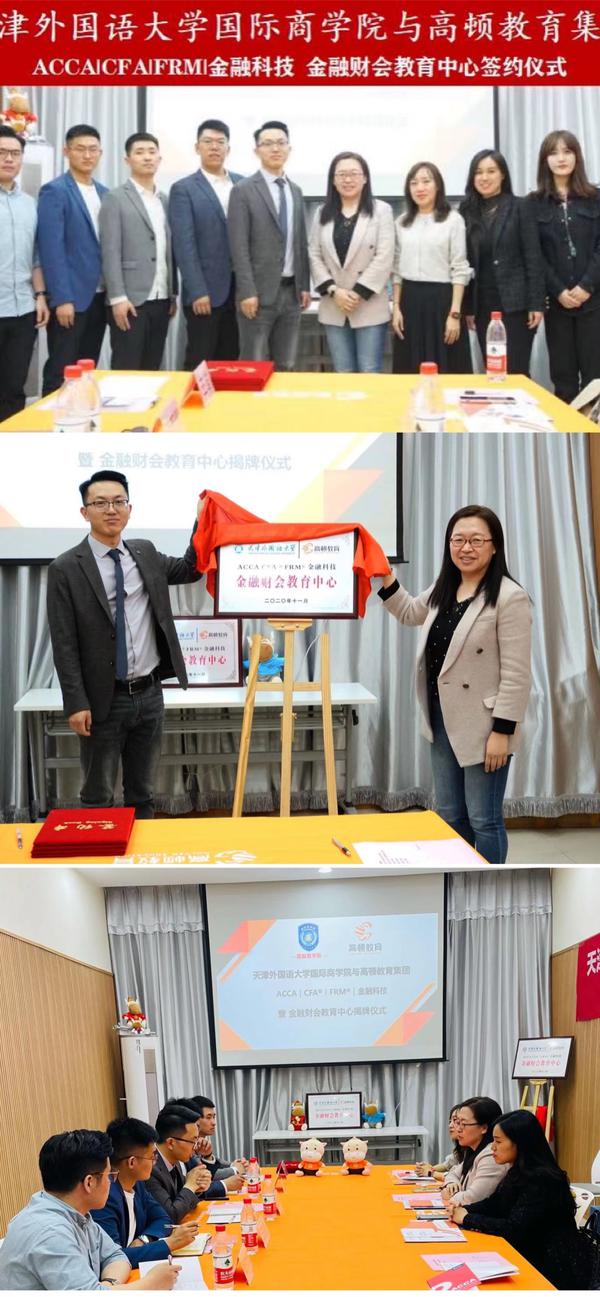 4月13日,我校国际商学院与上海高顿教育集团就ACCA、CFA®、FRM®、金融科技项目成立金融财会教育中心签约暨揭牌仪式在滨海校区举行。国际商学院党委书记杨颖,党委副书记、副院长刘斌斌,副院长李薇,上海高顿教育集团天津分公司总经理张长晴,市场部、CFA&FRM国际项目中心相关负责人出席本次活动。