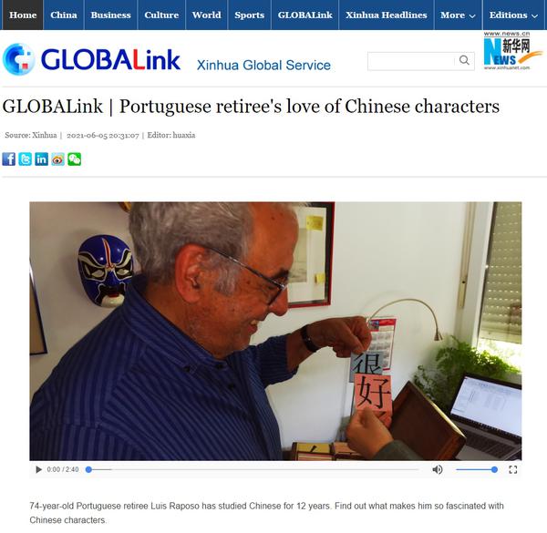 近日,新华网国际频道以《一位葡萄牙老人的中文情缘》为题,深度报道了我校里斯本大学孔子学院第一批学员------今年74岁的路易斯·拉波索的中文情缘。采访中,拉波索表示最感兴趣的是对汉字的研究,2010年曾在乐鱼·体育学习了一个月。在孔院学习之余,他还在当地社区大学教授中文,最大的梦想便是编写一本葡语版关于汉字起源的工具书,以帮助更多的葡萄牙人学习汉字,了解中国。里斯本大学孔子学院中方院长王锦程在采访中,也为拉波索学习中文的热情和执着点赞。