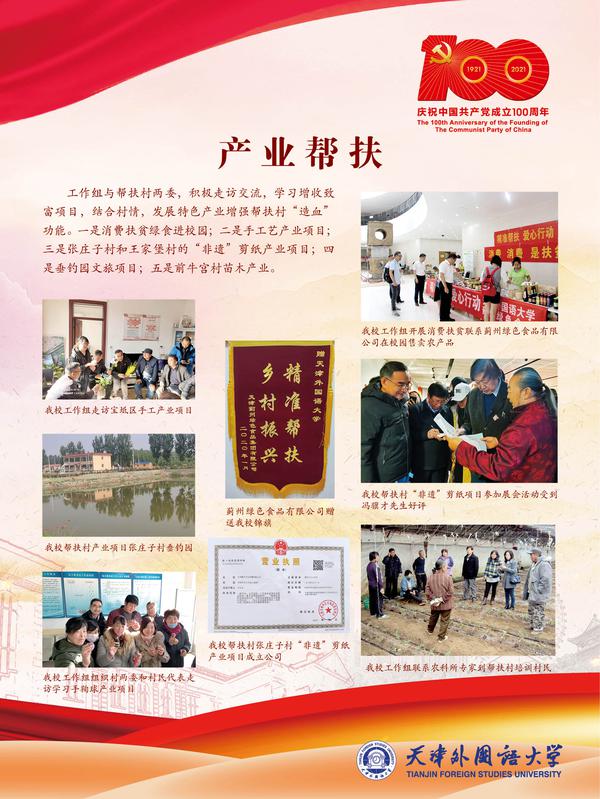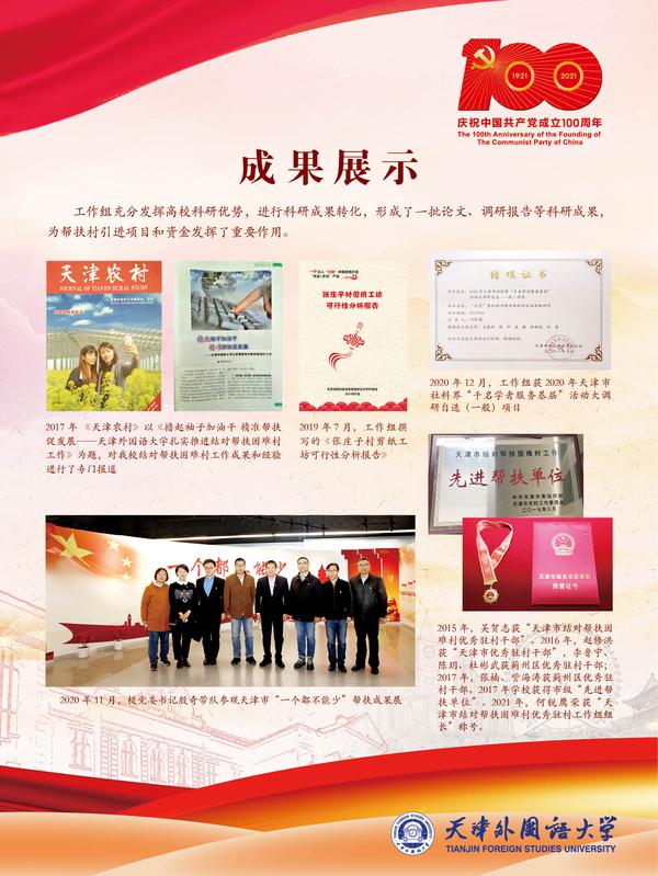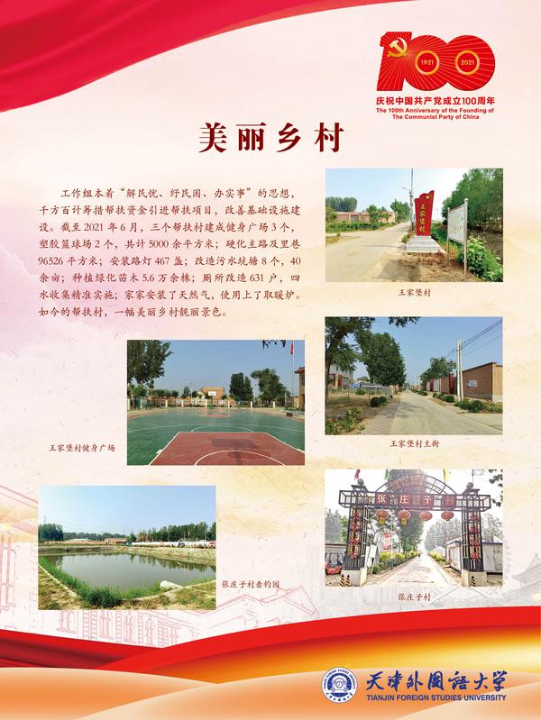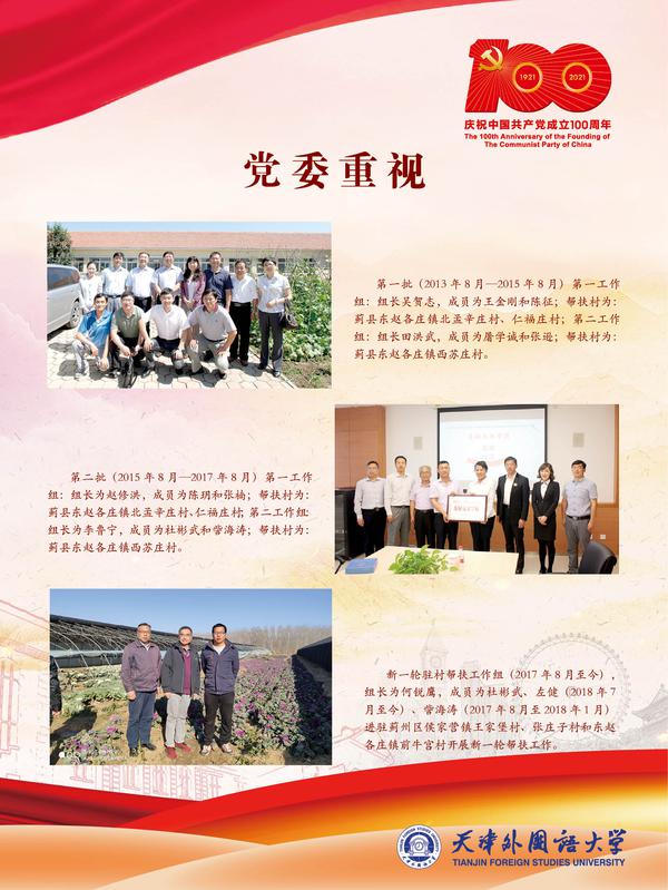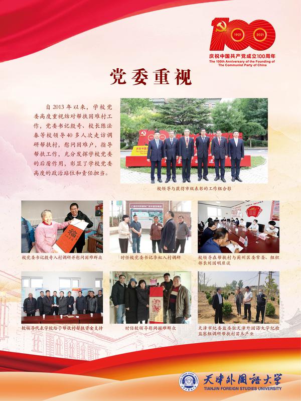 五个工作组,八年接续奋斗,有这样一群人,他们舍小家为大家,与村民同吃、同住、同劳动、同学习,被村民誉为“老百姓的贴心人”,在蓟州的土地上书写了脱贫攻坚的天外实践。为庆祝中国共产党成立100周年,驻村帮扶工作组联合党委组织部、党委宣传部主办题为“八年帮扶聚情怀 脱贫攻坚展风采”------乐鱼·体育结对帮扶困难村工作图片展,以实物实景为要素,从八个方面展现工作组紧紧围绕“三美四全五均等”73项考核指标,攻坚克难,逐项落地,使帮扶村取得了翻天覆地的变化,彰显了我校师生的责任担当与帮扶情怀。站在新的历史起点,天外人不忘初心,牢记使命,总结帮扶工作经验,开启新的奋斗征程,为建设特色鲜明高水平外国语大学、助力天津社会主义现代国际化大都市建设,实现中华民族伟大复兴的中国梦作出新的更大贡献。
