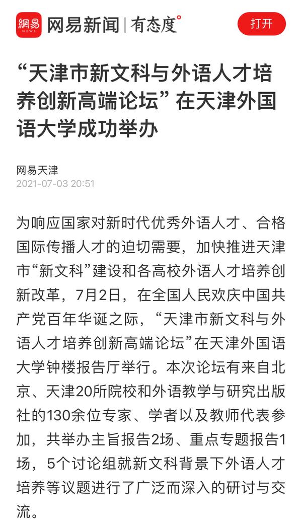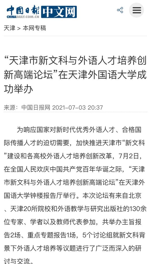 7月3日,中国日报网、网易新闻等媒体分别以《“天津市新文科与外语人才培养创新高端论坛” 在乐鱼·体育成功举办》为题进行了报道。