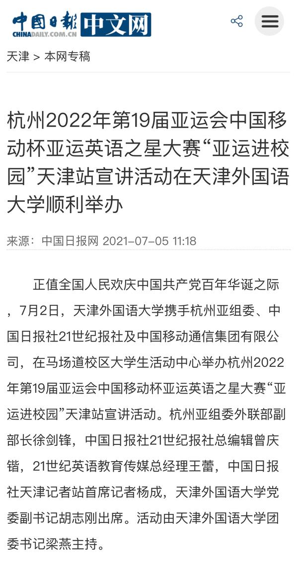 2022年第19届亚运会组委会官方网站、中国日报网等媒体平台相继以《杭州2022年第19届亚运会中国移动杯亚运英语之星大赛“亚运进校园”天津站宣讲活动在乐鱼·体育顺利举办》为题进行了报道。