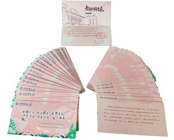 学院分工会给教师们送去了一封封节日贺卡,这些贺卡代表的不仅是节日的一份祝福,更是学院对教师们的关心和爱。贺卡的封面以《高等学校教师职业道德规范》的24字为主要内容------“爱国守法、敬业爱生、教书育人、严谨治学、服务社会、为人师表”,封底以新的教育思想、新的教育政策为主要内容,强调高校教师要将思想和行动统一到党中央的要求上来,增强“四个意识”,坚定“四个自信”,自觉做到“两个维护”,扎实有力推进“双减”工作。贺卡内是院长项成东代表英语学院亲笔所写的节日祝福语,苍劲有力的字体中带着爱的温度。