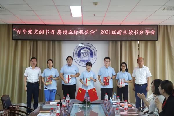 座谈会以“全校师生共读一本书”的形式,一起分享“新生书单”阅读心得。从《数学之美》到《月亮和六便士》,从《习近平在正定》到习近平同志《论中国共产党历史》,来自不同学院的11名同学分享了他们的阅读心得,结合自身成长经历畅谈如何更好地适应大学生活、涵养爱国情怀。“繁霜尽是心头血,洒向千峰秋叶丹。吾辈自需接过时代发展的接力棒,传承红色基因,汲取前行力量,以青春之我、奋斗之我为祖国建设添砖加瓦。”欧洲语言文化学院王一晴同学深情分享了《论中国共产党历史》的读后感。
