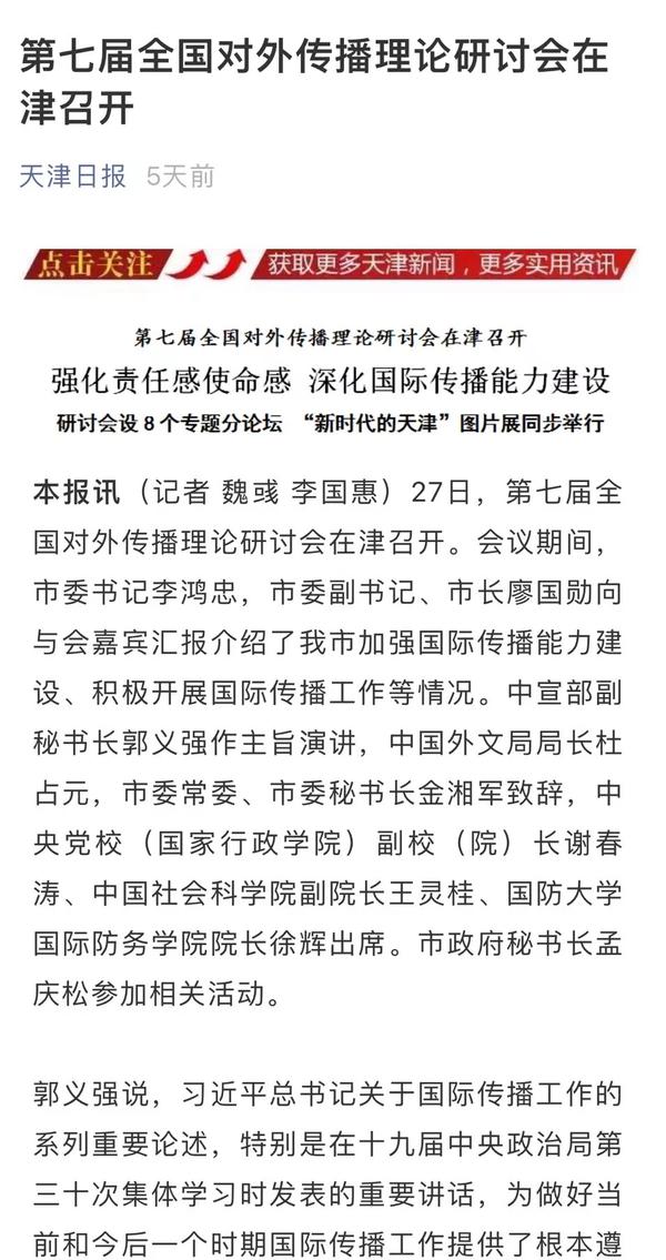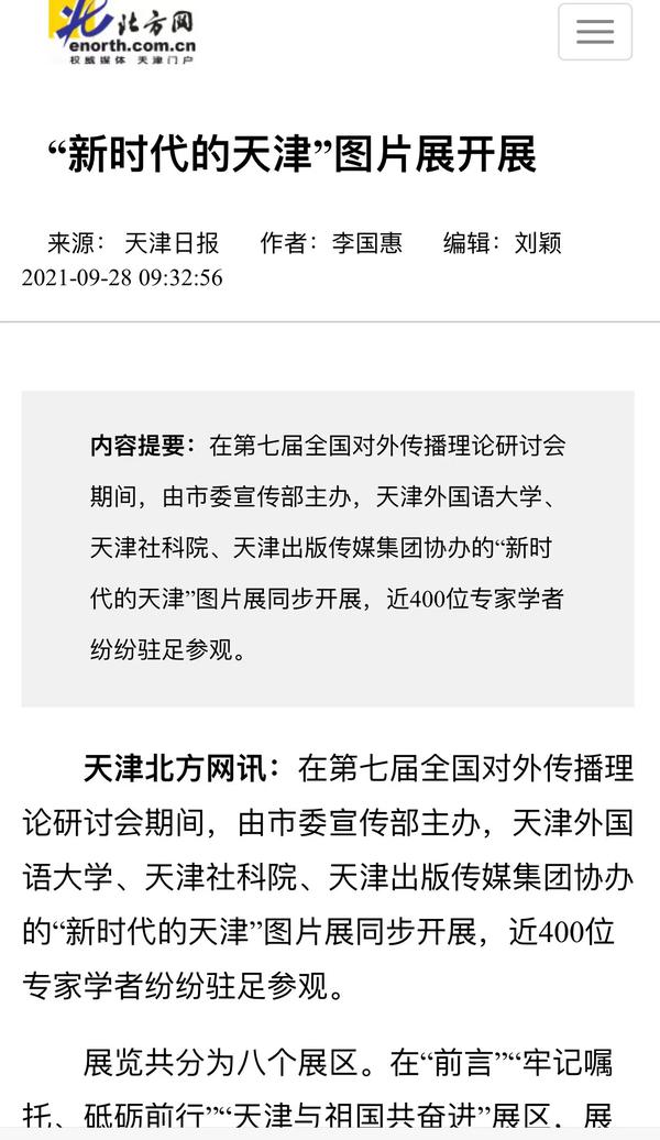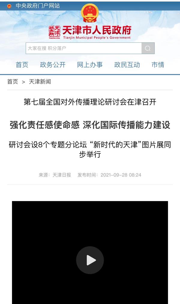 9月28日,天津市人民政府网以《强化责任感使命感 深化国际传播能力建设 第七届全国对外传播理论研讨会在津召开 研讨会设8个分论坛 “新时代的天津”图片展同步举行》为题,进行了报道。