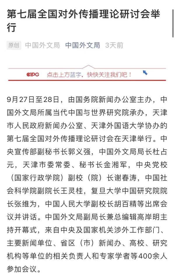 9月28日,中国外文局官网以《第七届全国对外传播理论研讨会举行》为题目,进行了报道。