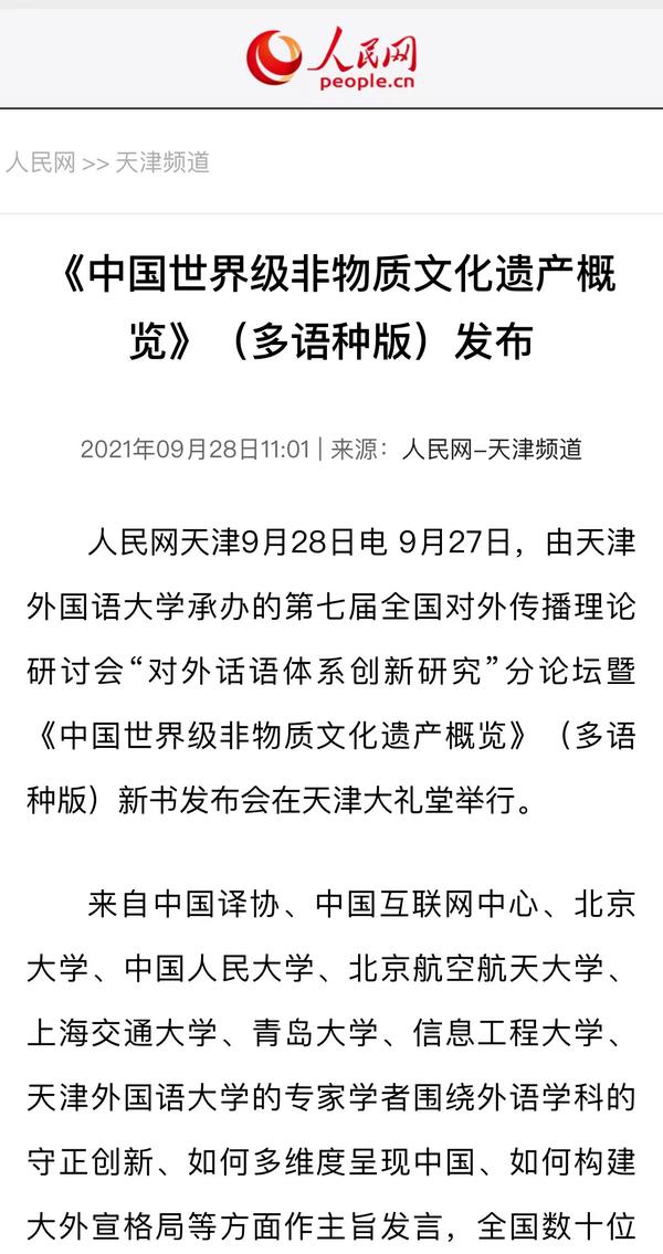 9月28日,人民网-天津频道以《<中国世界级非物质文化遗产概览>(多语种版)发布》为题进行了报道。