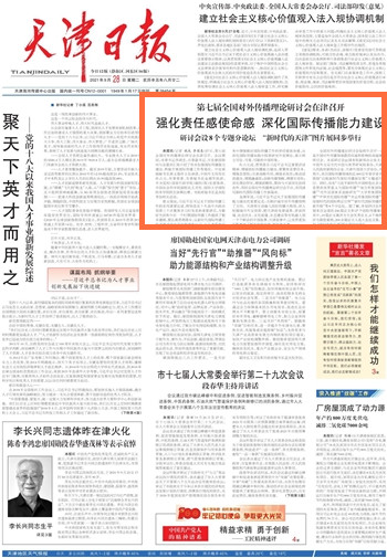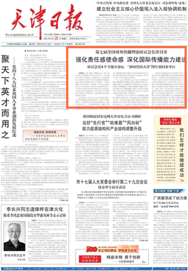 9月28日,《天津日报》以《第七届全国对外传播理论研讨会在津召开强化责任感使命感 深化国际传播能力建设》为题,进行了报道。