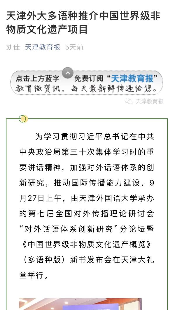 9月28日,《天津教育报》微信公众号以《天津外大多语种推介中国世界级非物质文化遗产项目》为题,进行了报道。
