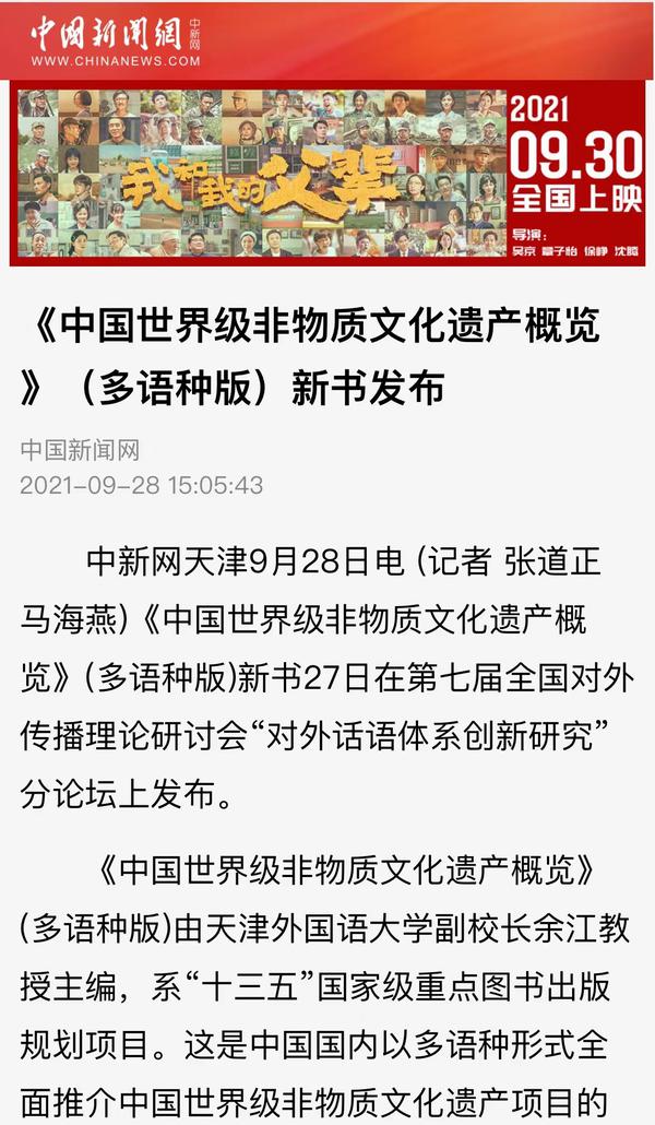 9月28日,中国新闻网以《<中国世界级非物质文化遗产概览>(多语种版)新书发布》为题进行了报道。
