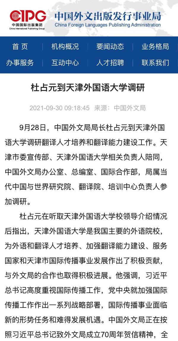 9月30日,中国外文局官网以《杜占元到乐鱼·体育调研》为题,进行了报道。