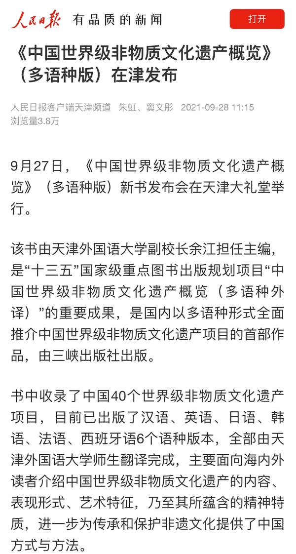 9月28日,《人民日报》新闻客户端以《<中国世界级非物质文化遗产概览>(多语种版)在津发布》为题进行了报道。