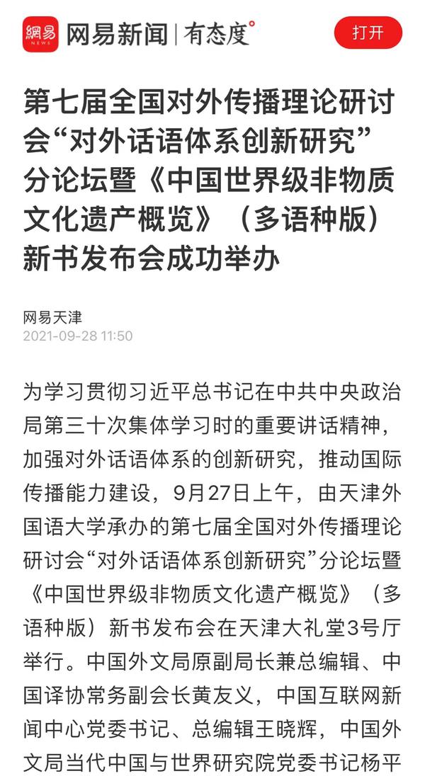 9月28日,网易新闻以《第七届全国对外传播理论研讨会“对外话语体系创新研究”分论坛暨<中国世界级非物质文化遗产概览>(多语种版)新书发布会成功举办》为题,进行了报道。