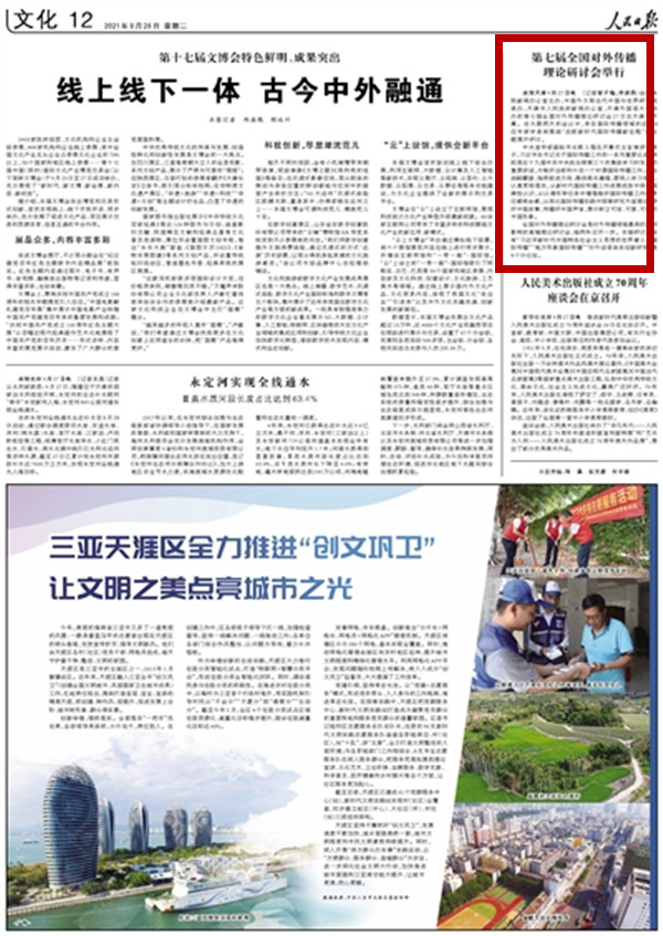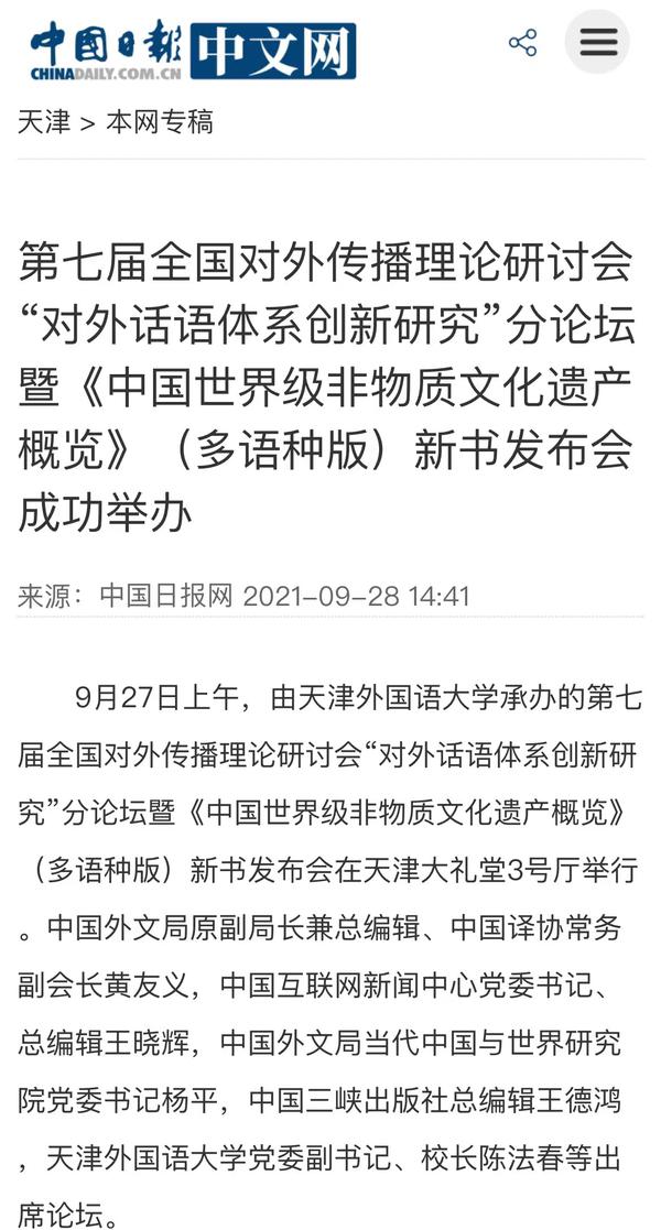 9月28日,中国日报网以《第七届全国对外传播理论研讨会“对外话语体系创新研究”分论坛暨<中国世界级非物质文化遗产概览>(多语种版)新书发布会成功举办》为题,进行了报道。