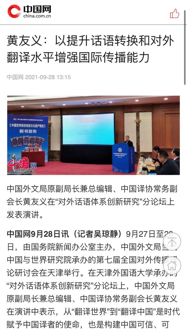 9月28日,中国网以《黄友义:以提升华语转换和对外翻译水平增强国际传播能力》为题进行了报道。