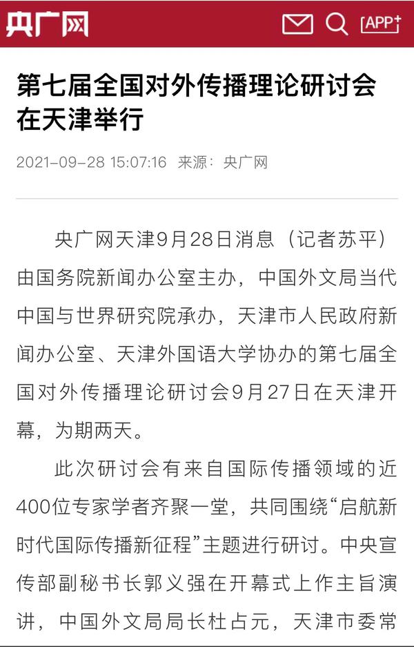 9月28日,央广网以《第七届全国对外传播理论研讨会在天津举行》为题进行了报道。