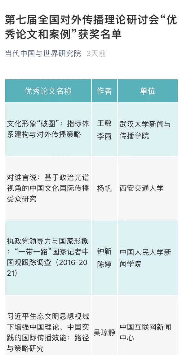 9月30日,当代中国与世界研究院官方微信公众号公布《第七届全国对外传播理论研讨会“优秀论文和案例”获奖名单》,我校教师荣获优秀论文奖。