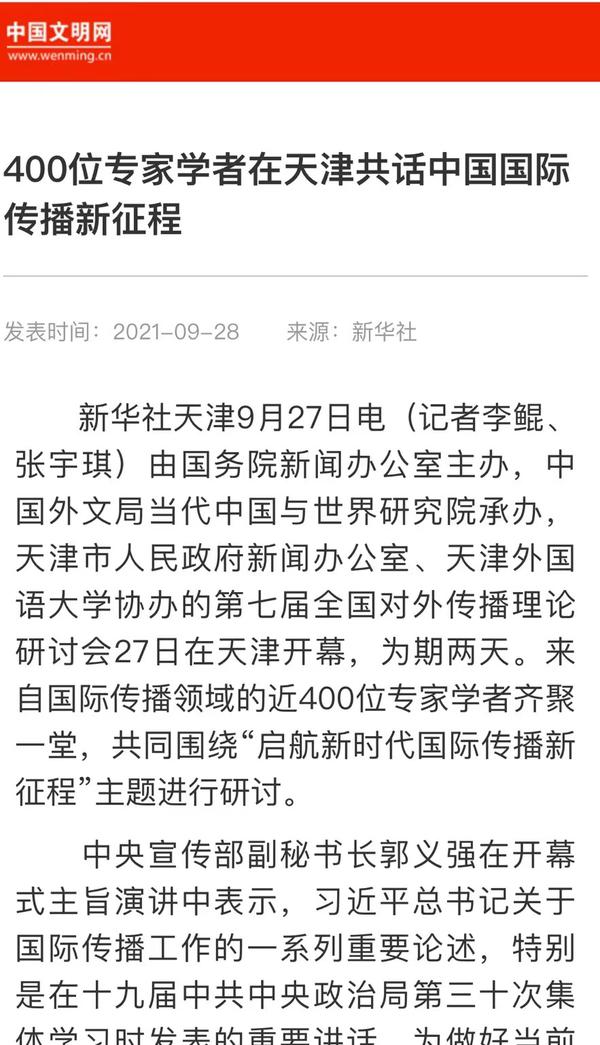 9月28日,中国文明网以《400位专家学者在天津共话中国国际传播新征程》为题,进行了报道。