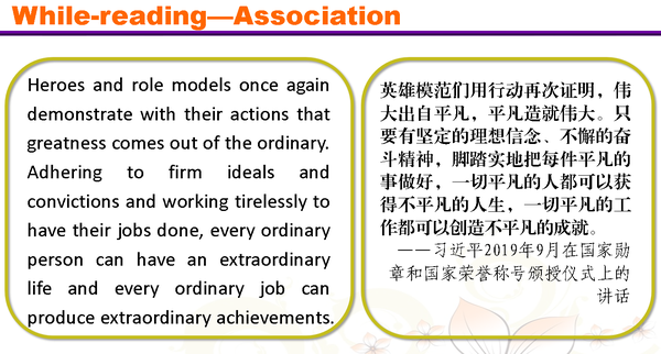 2.精读课文过程中,提炼出中重点单词、短语与句型,并引入富有思政元素的例句,强化语言基本功。