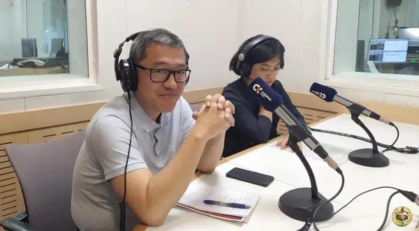 励立德教授(左一)在当地电台录制节目宣传中国文化