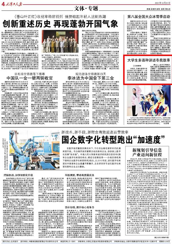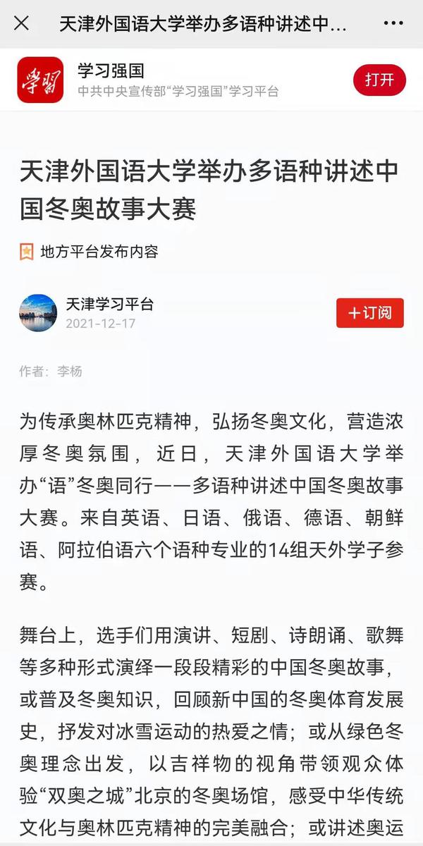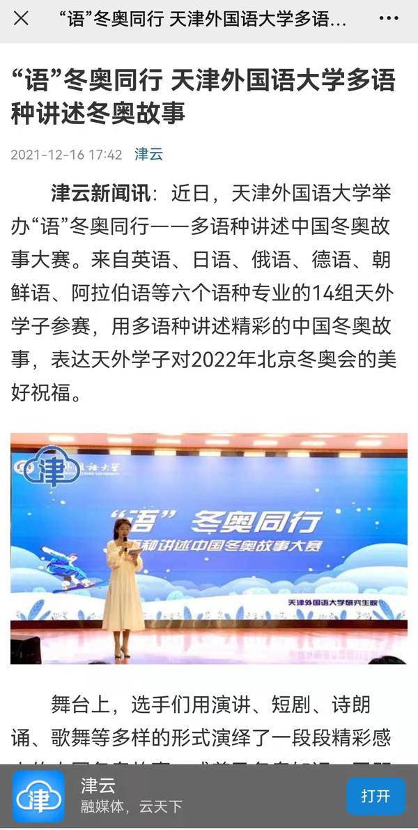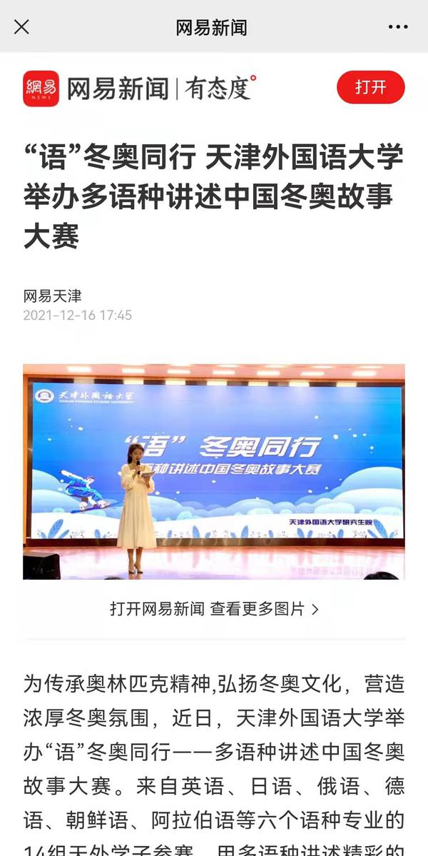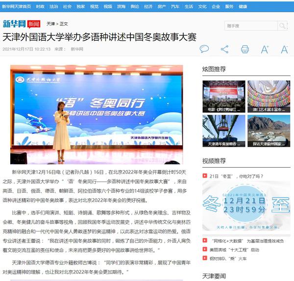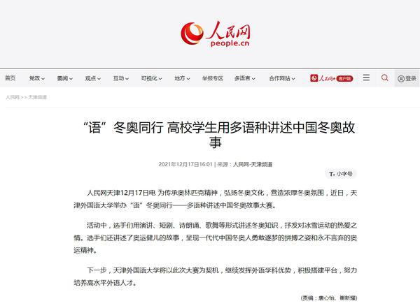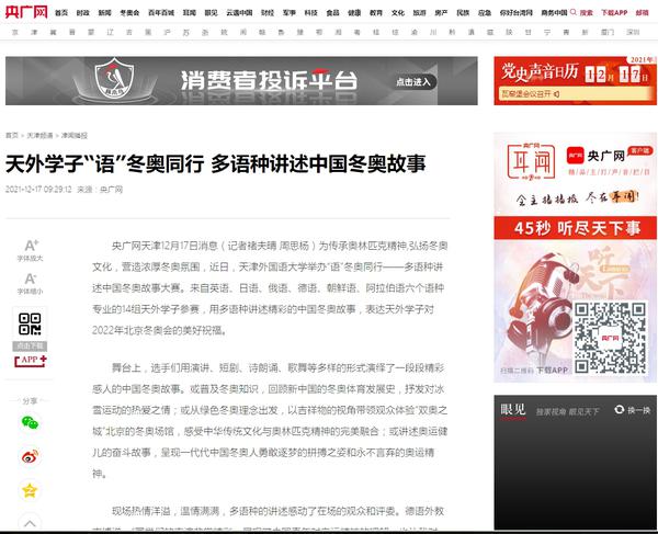 为传承奥林匹克精神,弘扬冬奥文化,营造浓厚冬奥氛围,我校举办“语”冬奥同行------多语种讲述中国冬奥故事大赛,用多语种讲述精彩的中国冬奥故事,表达天外学子对2022年北京冬奥会的美好祝福。人民网、新华网、中国新闻网、央广网、学习强国APP、《今晚报》《天津工人报》、津云客户端、网易新闻等多家媒体对此进行了报道。