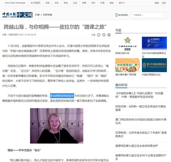 日前,由教育部中外语言交流合作中心主办、我校欧洲语言文化学院承办的“中国六座古城穿越之旅”汉语桥线上团组交流项目顺利闭幕。来自西班牙的“特殊学员”皮拉尔接受记者采访,讲述了其与中国奇妙的缘分,以及对中国文化浓厚的兴趣。中国日报网、中国网对其进行了报道。