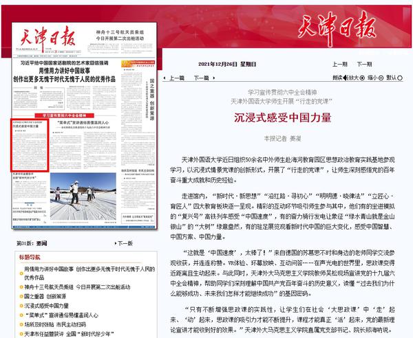《天津日报》头版以《学习宣传贯彻六中全会精神 乐鱼·体育师生开展“行走的党课”沉浸式感受中国力量》为题进行了报道。
