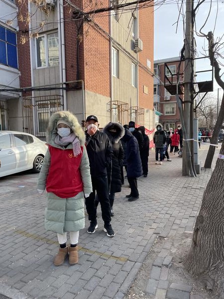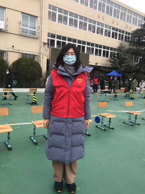 教务处王济军老师义不容辞担当起了志愿者并化身宣传员,用相机记录社区一线工作人员忘我工作、守护家园的身影,他主动引导、维持秩序,为残障老人推轮椅,为老弱小安排绿色通道等。周凯老师夫妻俩安顿好孩子后,成为社区内的夫妻志愿者搭档,从9日晚上起就投入引导秩序、协助入户检测等工作,因社区楼宇分散,12日结束第二轮筛查最后一个点位的工作已近零点。马慧老师组织居民以10人为单位进行登记、检测,合理引导高龄老人、体弱病人和低龄儿童通过绿色通道快速检测,尽量减少寒冬天气的室外等待时间,同时耐心解答居民关于防疫的各种问题。窦伟老师与爱人在全城启动第一次大筛之前,便早早去景兴西里社区报到,12日晚上,社区二筛如火如荼,得知夜晚社区人手不足,当孩子进入梦乡后,她主动下沉社区,承担夜间至凌晨班次,直到社区完成二筛。