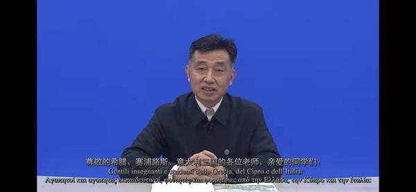 希腊驻华使馆新闻与公共外交办公室新闻参赞海恩福(E.Athanasiadis)先生为项目发来致辞视频。他强调了教育交流,特别是语言文化交流对于国家之间政治、经济、文化等多方面双边关系发展的重要性,充分肯定了本次“汉语桥”项目对于两国关系发展的重要意义,并用中希双语为到场的学员和教师们表示祝福和感谢。