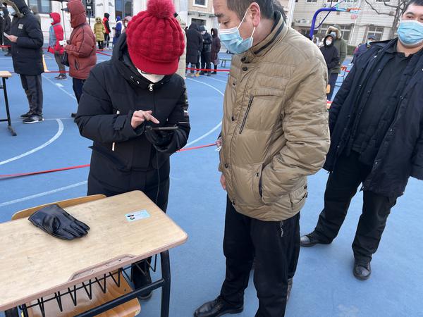 为了更好地了解楼里的情况,争取不落下任何一人,李永村和爱人在群里统计各户人数,注明每户老人和孩子的情况,然后按1到26层排序,这样就可以在楼门口有效掌握进出的人员情况。因为室外温度太低,他们有序安排楼里的老人孩子下楼先做,在检查完健康码后,带领他们到检测点。