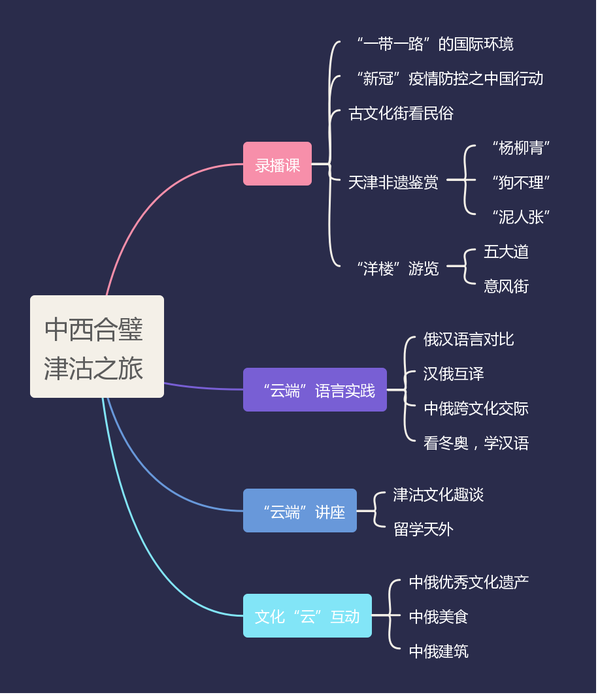 本项目是我校欧洲语言文化学院承办的2021年度6个“汉语桥”项目之一,同时也是庆祝《中俄睦邻友好合作条约》签署20周年系列活动框架内“中俄友谊,薪火相传”专项活动。项目依托天津多个国家级非物质文化遗产且极具地方特色的优势资源------天津中西合璧、古今融合的各大文化特色景点,如意大利风情区、望海楼建筑群、瓷房子、海河、五大道、“杨柳青”、“泥人张”、“狗不理”等中华老字号工作室等,为学员开启魅力独特的“津沽文化”之旅。项目旨在通过语言了解文化知识,依托文化强化语言学习,讲好天津故事,促进中外交流。