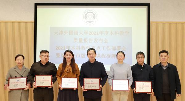 会上,校领导分别对第二批天津市一流本科建设课程负责人进行授牌颁奖。教务处处长刘建喜发布2021年度本科教学质量报告。本次会议正式吹响了迎评工作的“冲锋号”,全校上下要充分认识审核评估工作的重要性,统一思想,凝心聚力,全力以赴做好评建工作,以优异的成绩推进学校高质量发展再上新台阶。