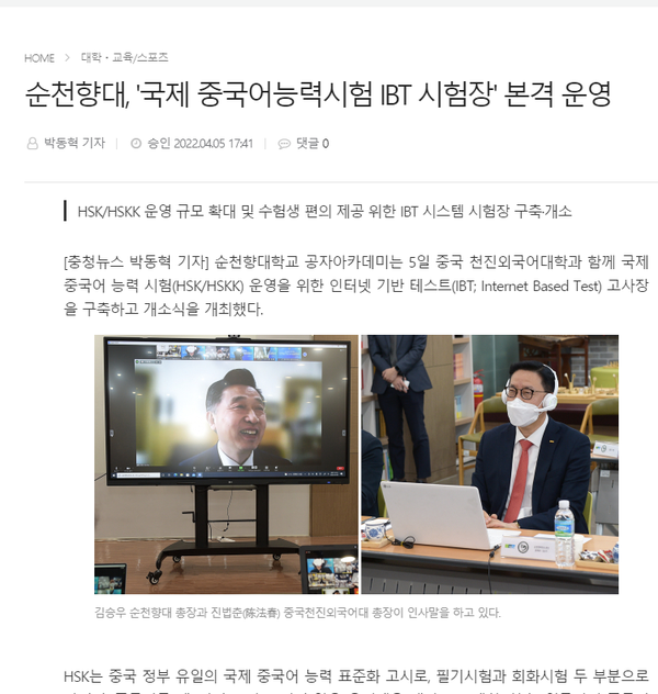 顺天乡大学孔子学院自2007年开办以来,曾3次荣获全球“先进孔子学院”奖项,2人获“孔子学院先进个人”称号。基于新冠肺炎疫情及元宇宙概念背景下不断变化的教育环境,顺天乡大学孔子学院国际汉语水平考试(HSK/HSKK)IBT(Internet Based Test)考试中心的成立,将为韩国顺天乡大学及大学所在牙山地区的汉语学习者提供更多学习便利,有助于进一步提升孔子学院在当地的影响力。据悉,该考试中心将于4月9日开考。