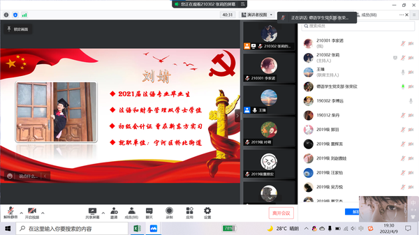 活动中,两位学姐分别与学生党员们分享了基层就业准备和工作心得。陈晓玥是天津市“青马工程”第一期学员,2019年顺利通过天津市选调生考试,现就职于河西区天塔街道。根据前期问卷调查的结果,陈晓玥就大家最关心的公务员考试备考时间、报考岗位的选择、备考与专业学习的平衡等三个问题进行了解答。她建议同学们要保证专业课的学习,打好语言基础,同时提前做好职业规划,备考公务员的同学要在考前两个月找到适合自己的做题节奏,有针对性地进行系统突破。她还提醒同学们要把握好应届生的身份,以积极的心态报考“三不限”岗位。刘婧于2021年成功考取天津市社区工作者,现就职于宁河区桥北街道。她向大家详细介绍了历年报考要求、时间安排、题型和笔面试经验,并对基层党务工作者与社区工作者的异同进行了对比分析。支部党员认真聆听两位学姐的分享,就自己关心和困惑的基层就业问题向学姐踊跃提问。