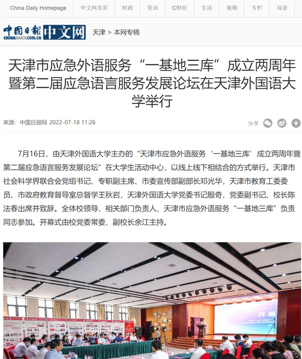 中国日报网以《天津市应急外语服务“一基地三库”成立两周年暨第二届应急语言服务发展论坛在乐鱼·体育举行》为题进行报道。
