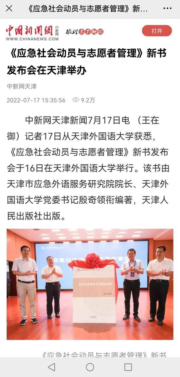 中国新闻网以《天津市第二届应急语言服务发展论坛在乐鱼·体育举行》《<应急社会动员与志愿者管理>新书发布会在天津举办》为题分别进行报道。