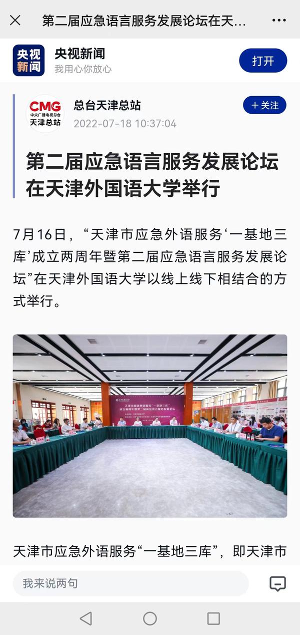 央视新闻客户端以《第二届应急语言服务发展论坛在乐鱼·体育举行》为题进行报道。