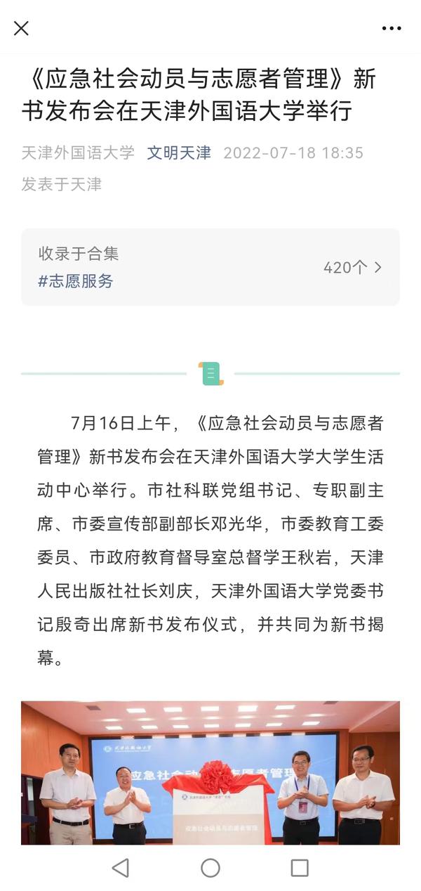 “文明天津”微信公众号以《<应急社会动员与志愿者管理>新书发布会在乐鱼·体育举行》为题进行报道。