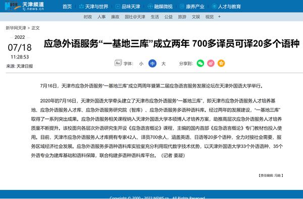 《天津日报》以《应急外语服务“一基地三库”成立两年 700多译员可译20多个语种》为题进行报道。